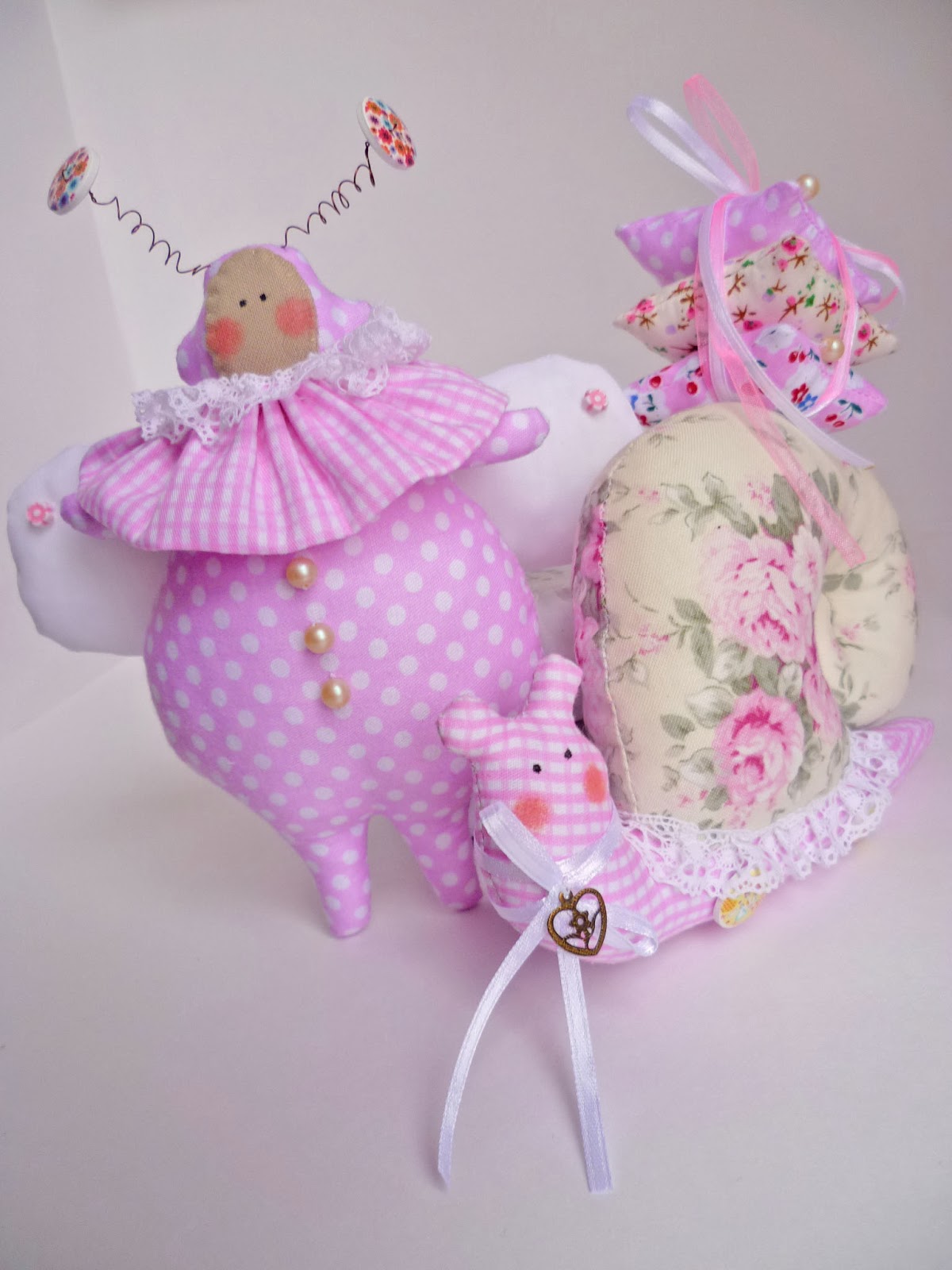 Все в нежных розовых оттенках.Лилия попросила сшить улитку и жука в дополнение к принцессе на горошине.Ощущения во время пошива были необыкновенные,как-будто своей доче шила,не думала,что так приятно шить маааленьким деткам))))))))
